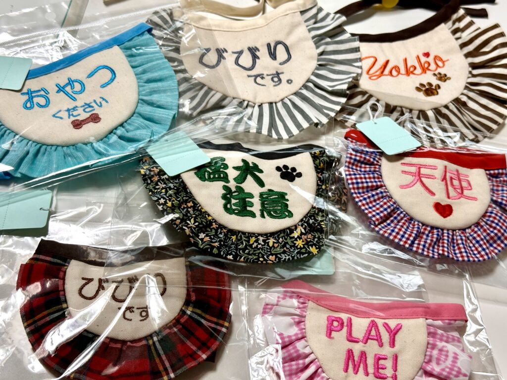 あんかのってのAnimalコレクションは、 ペットとの日常をそっと彩るオリジナル刺繍グッズです。 おしゃべりスタイ(メッセージ入り犬用スタイ)、 キーホルダー、立体ブローチ、メモリアル刺繍などのグッズを 業務用ミシンを使い、一点ずつ丁寧に仕上げています。